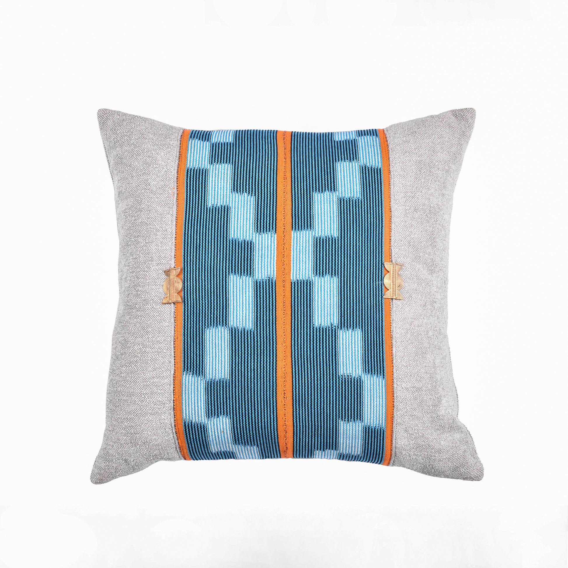 Elevate your space with The Little Bassam, a beautifully crafted decorative cushion that brings a touch of refined elegance to your sofa or armchair. This edition features authentic Baoulé cloth, handwoven in Northern Côte d’Ivoire, paired with a light grey solid fabric for a sleek, contemporary contrast. Finished with brass accents, each piece celebrates African artistry and the rich cultural heritage woven into every thread.